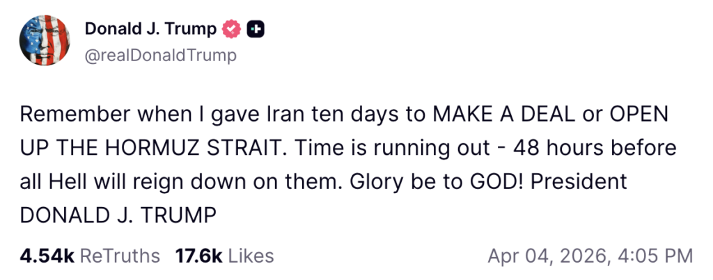 Über Truth Social hat US-Präsident Donald Trump sein Ultimatum an das Mullah-Regime im Iran erneuert: Entweder es würde die Meerenge von Hormus öffnen oder sich auf eine Übereinkunft einigen, oder es werde in 48 Stunden „die Hölle“ über sie hereinbrechen, so Trump.
