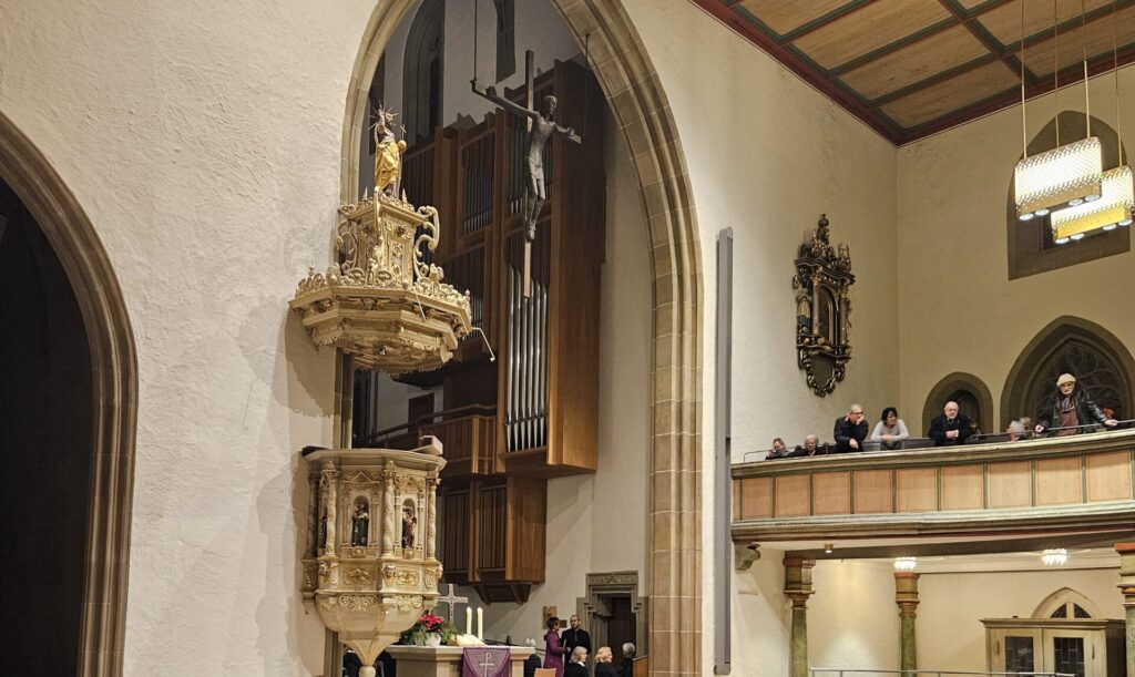 Unter den Augen von Jesus-Darstellungen als Gekreuzigtem und Christkönig wurde der Gebetsruf vorgetragen.