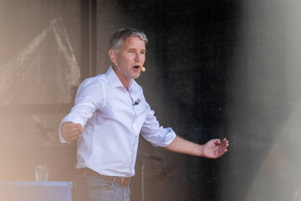Björn Höcke auf der Bühne in Bayern und plötzlich steht ein Wort im Raum,