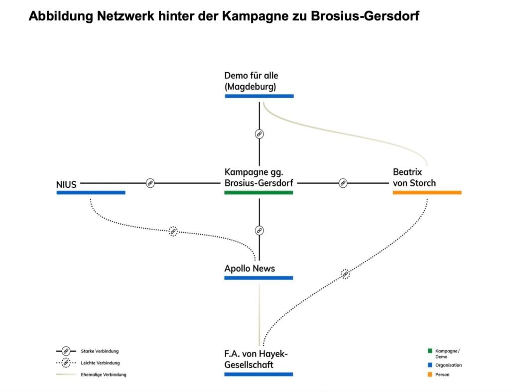 Kemper: „… Kooperationen mit rechten Medien wie Achse des Guten, Tichys Einblick und später NIUS lässt sich ein eng vernetztes Medienumfeld erkennen, …“
