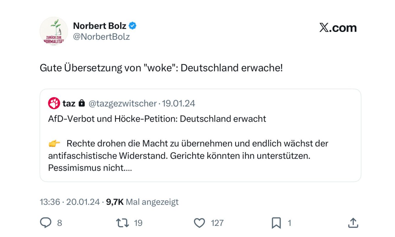 Am 20. Januar 2024 hatte Bolz auf X (ehemals Twitter) in einem Beitrag geschrieben: „Gute Übersetzung von ‚woke‘: Deutschland erwache!“ Dabei zitiert Bolz einen Beitrag der Taz – dort kommt die Parole ebenfalls vor. Die linke Tageszeitung hatte die Parole ursprünglich auch in der Schlagzeile eines Artikels verwendet: „AfD-Verbot und Höcke Petition: Deutschland erwacht“, hieß es bei der Taz.