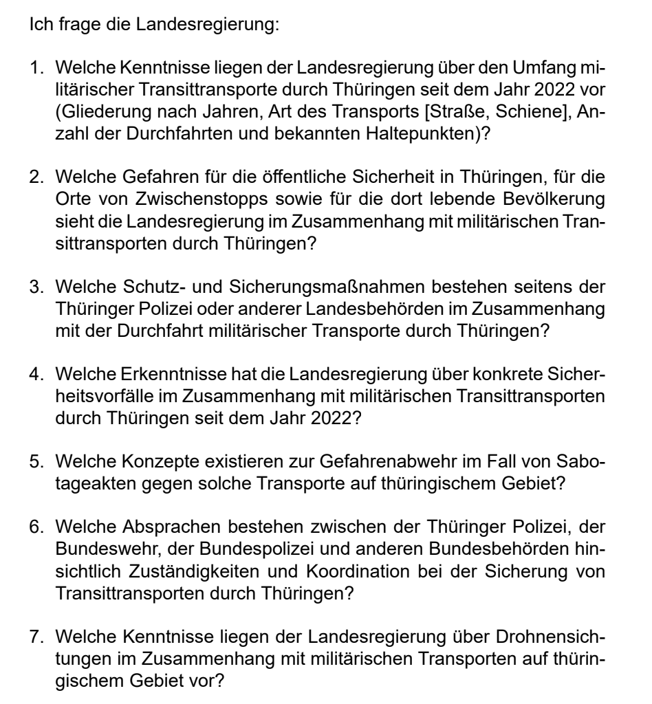 Grünen-Politikerin Irene Mihalic möchte eine Einschränkung des AfD-Fragerechts im Bundestag rechtlich prüfen lassen. Auch CDU-Politiker und Kontrollgremiumschef Henrichmann fordert nach bislang haltlosen Vorwürfen der Spionage gegen die AfD Konsequenzen.So fragte Mühlmann etwa an zum Stand bei den Drohnenabwehr-Fähigkeiten der Landespolizei, zur „Sicherheitslage und Vorsorge in Thüringen im Lichte internationaler Konflikte“ oder zum Digitalfunk bei den Landesbehörden. Oft bezieht sich der Abgeordnete auch auf Medienberichte, etwa auf einen der Wirtschaftswoche zu russischen Drohnen über Deutschland. In einer anderen Anfrage dreht es sich um militärische Transittransporte durch Thüringen und deren Sicherung.