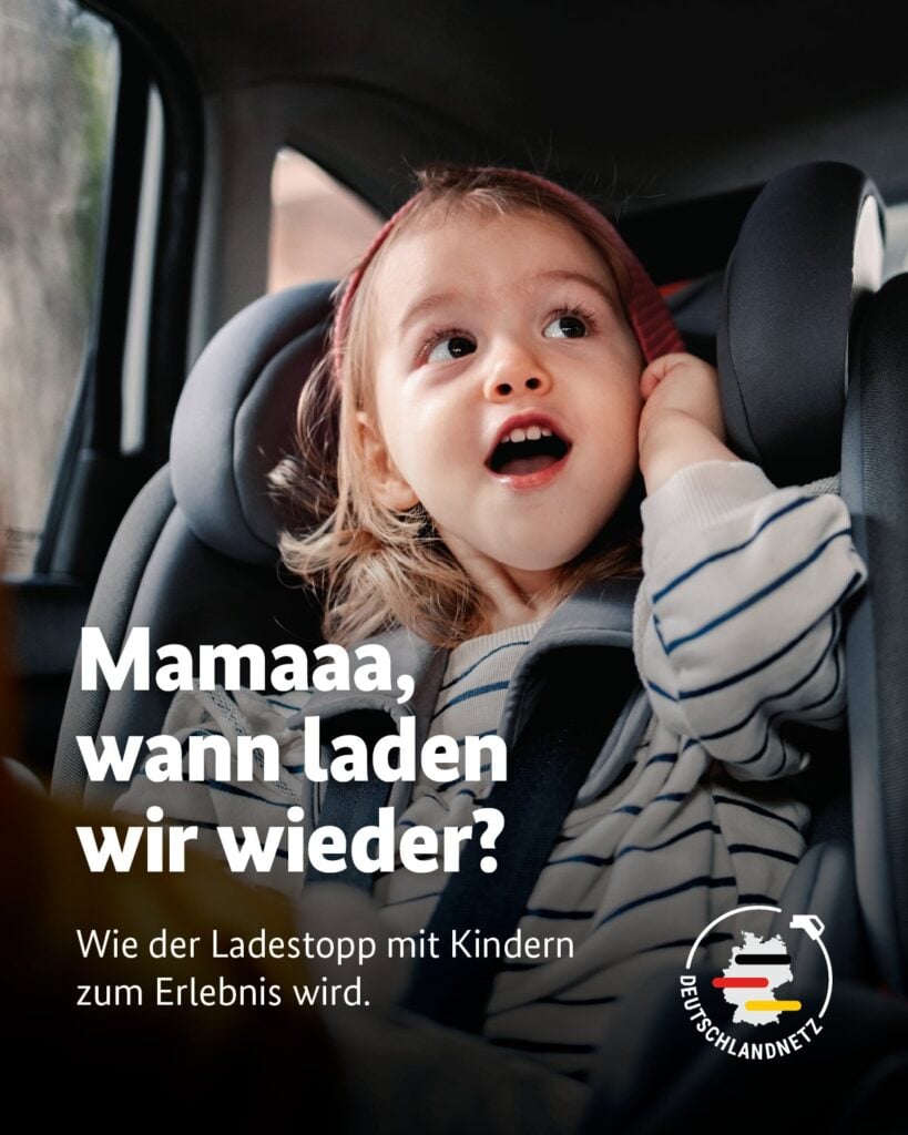 Untertitelt wird das Motiv mit der Aussage: „Wie der Ladestopp mit Kindern zum Erlebnis wird.“ Die Darstellung kehrt damit bewusst die typische Erwartungshaltung um: Statt Ungeduld oder Langeweile soll Vorfreude auf den nächsten Ladestopp vermittelt werden.