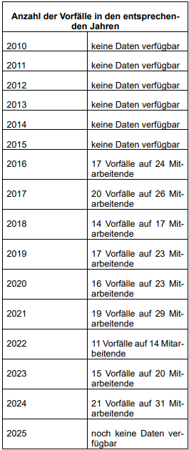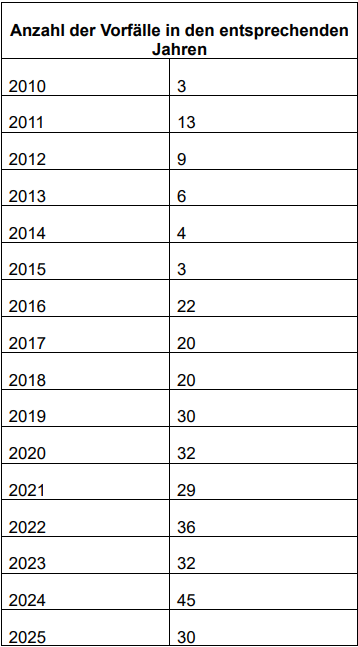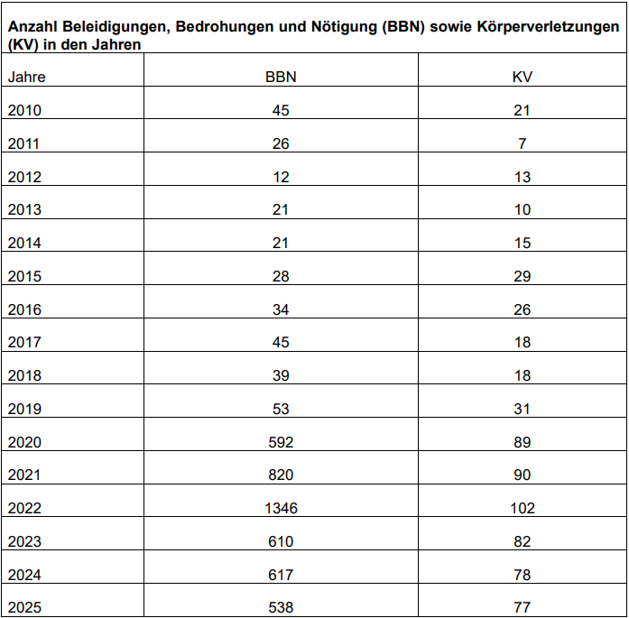 Auch bei den Beleidigungen, Bedrohungen und Nötigungen kam es nach 2020 zu einem rasanten Anstieg. Wurden von 2010 bis 2019 noch durchschnittlich zu 32 Fällen in dieser Kategorie gezählt, waren es im Jahr 2020 bereits 592 und 2022 sogar 1346 Fälle. Auch wenn es im darauffolgenden Jahr mit 610 Fällen wieder deutlich weniger waren, entspricht diese Zahl fast einer Verzwanzigfachung im Vergleich zum Durchschnitt von 2010 bis 2019.