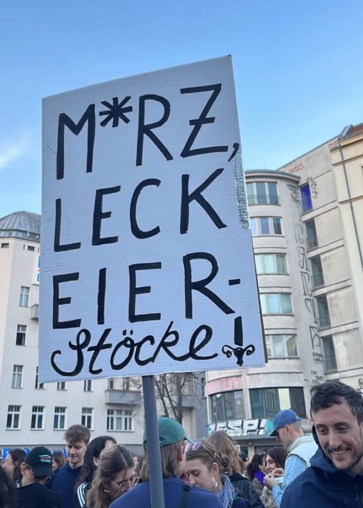 Die Berliner Polizei hat am vergangenen Wochenende eine Demo-Teilnehmerin wegen eines satirischen Plakat-Slogans angezeigt. Die 36-jährige Rollstuhlfahrerin trug ein Transparent mit der Aufschrift „M*rz, leck Eierstöcke“ – jetzt ermittelt die Polizei wegen Politikerbeleidigung.