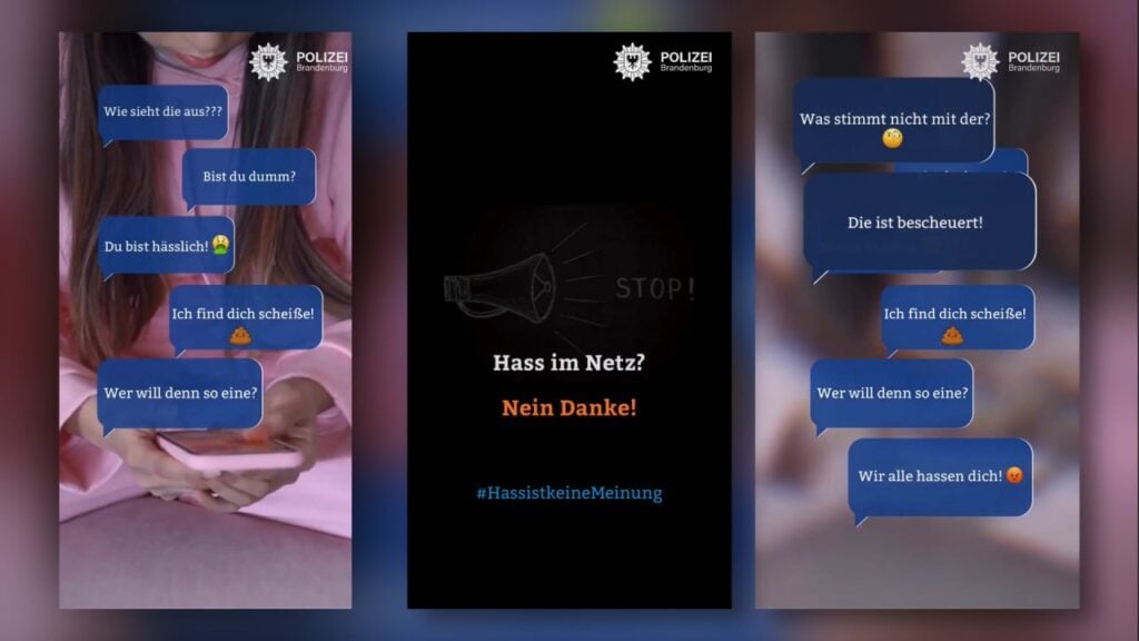Die Polizei Brandenburg hat auf X einen Kampagnenbeitrag gegen sogenannte „Hassrede“ veröffentlicht und dazu aufgerufen, entsprechende Beiträge zu melden und anzuzeigen. Zur Veranschaulichung werden darin in einem Video verschiedene Beispielaussagen angeführt, die nicht zwingend strafbar sind, im Beitrag jedoch als justiziable Grenzüberschreitungen dargestellt werden.