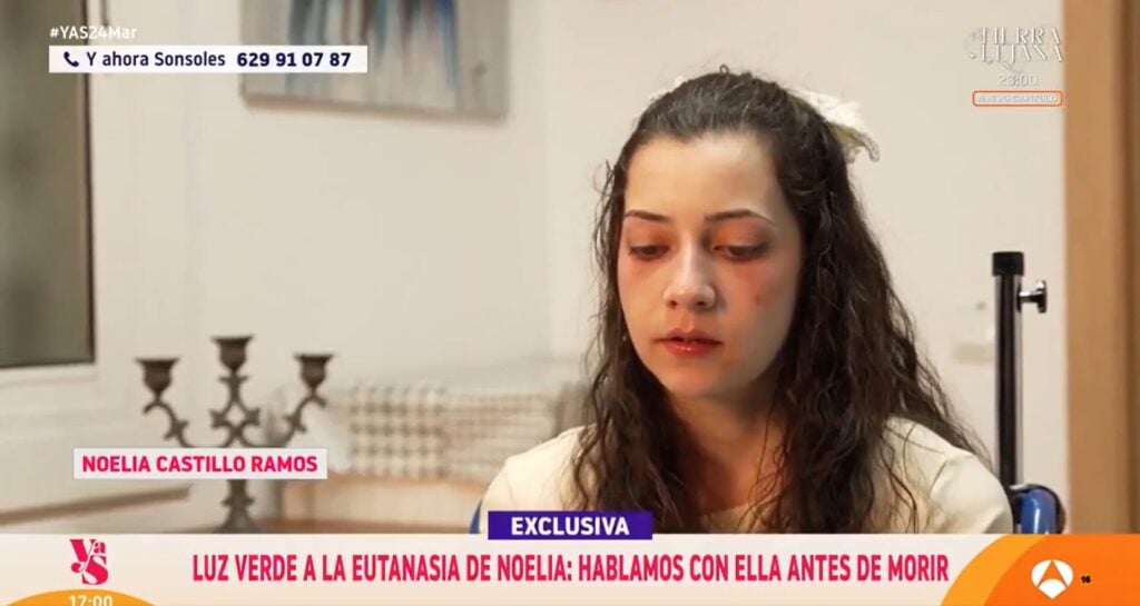 Noelia Castillo Ramos wurde Opfer einer Gruppenvergewaltigung. In der Folge versuchte sie am 4. Oktober 2022, sich das Leben zu nehmen, indem sie aus dem fünften Stock sprang. Wie die Zeitung El Mundo berichtete, erlitt sie eine schwere und irreversible Schädigung des Rückenmarks – eine vollständige Paraplegie, die sie von der Hüfte abwärts lähmt und mit starken Nervenschmerzen sowie Inkontinenz einhergeht.