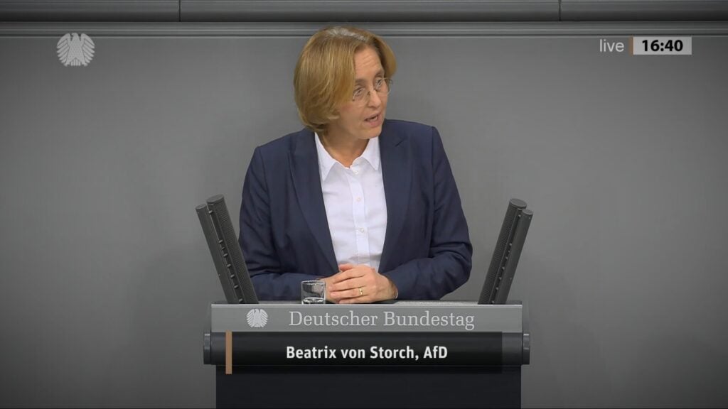 Im Nahen Osten gebe es häufig „nur die Wahl zwischen Pest und Cholera“, so von Storch. Pest sei ein Iran mit Atomwaffen und ein atomares Wettrüsten in der islamischen Welt. Cholera hingegen sei „eine Militärintervention im Iran mit unklarem Ziel und ungewissem Ausgang“, erklärte die AfD-Politikerin. Deutschland sei nur Zuschauer, könne weder verhindern, dass der Iran Atomwaffen erlange, noch das Regime stürzen, noch den Krieg verhindern.