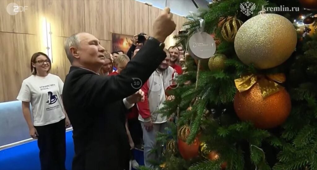 Als „schönster Weihnachtsbrauch von allen“ wird dabei die Tradition beschrieben, Wunschzettel in den Baum zu hängen. Dann zeigt ein manipuliertes Video Putin, der seinen Wunschzettel vom Weihnachtsbaum abzieht. Darauf stehen übereinander vier Territorien: „Estland Lettland Litauen Sachsen“.