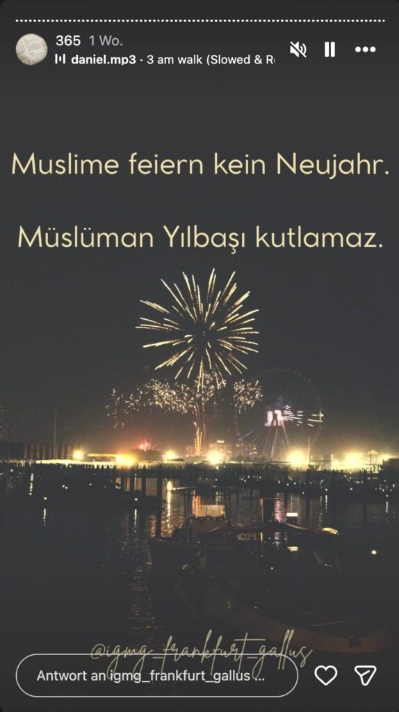 Der Grund für die Feierlichkeiten, die „Eroberung Mekkas“, ist dabei aus der Luft gegriffen. Vielmehr geht es darum, den christlichen Jahreswechsel zu okkupieren. Bei der Millî-Görüş-Gemeinde Frankfurt-Gallus heißt es auf Instagram ganz offen: „Muslime feiern kein Neujahr.“ In einer ebenfalls dort verbreiteten Veranstaltungseinladung der Berliner „Fatih Jugend“ wird jede Integration abgelehnt: „Wer ein Volk nachahmt, gehört zu ihnen.“
