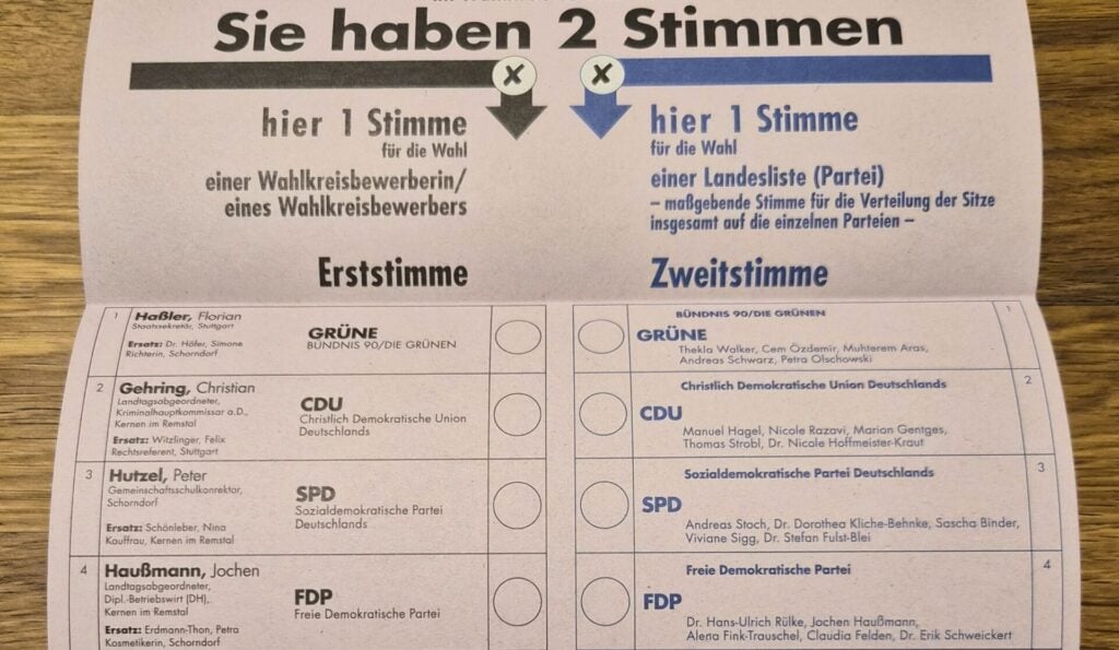 Denn das Konzept „Zweitstimme“ ist in Baden-Württemberg noch ganz neu. Bis 2021 gab es bei Landtagswahlen dort nur eine Stimme, mit der sowohl ein Kandidat als auch eine Partei gewählt wurde. Nicht einmal Parteilisten gab es: Um das Verhältnis der Parteien im Landtag nach ihrem Stimmenergebnis abzubilden, erhielten die besten Wahlkreisverlierer Sitze zugeteilt.