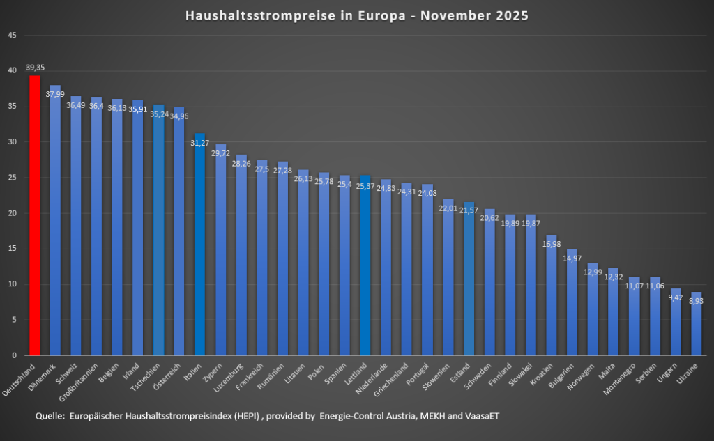 Beginnen wir mit der Ist-Situation in Deutschland im Vergleich zu seinen europäischen Nachbarn. Der Household Energy Price Index (HEPI) weist für November 2025 aus, dass Deutschland mit einem Durchschnittspreis von 39,35 Cent je Kilowattstunde der teuerste Haushaltsstrommarkt Europas ist – vor der Nummer zwei, der Windkraftnation Dänemark. Schon dieser Befund zeigt: Von einer entspannten Ausgangslage kann keine Rede sein.